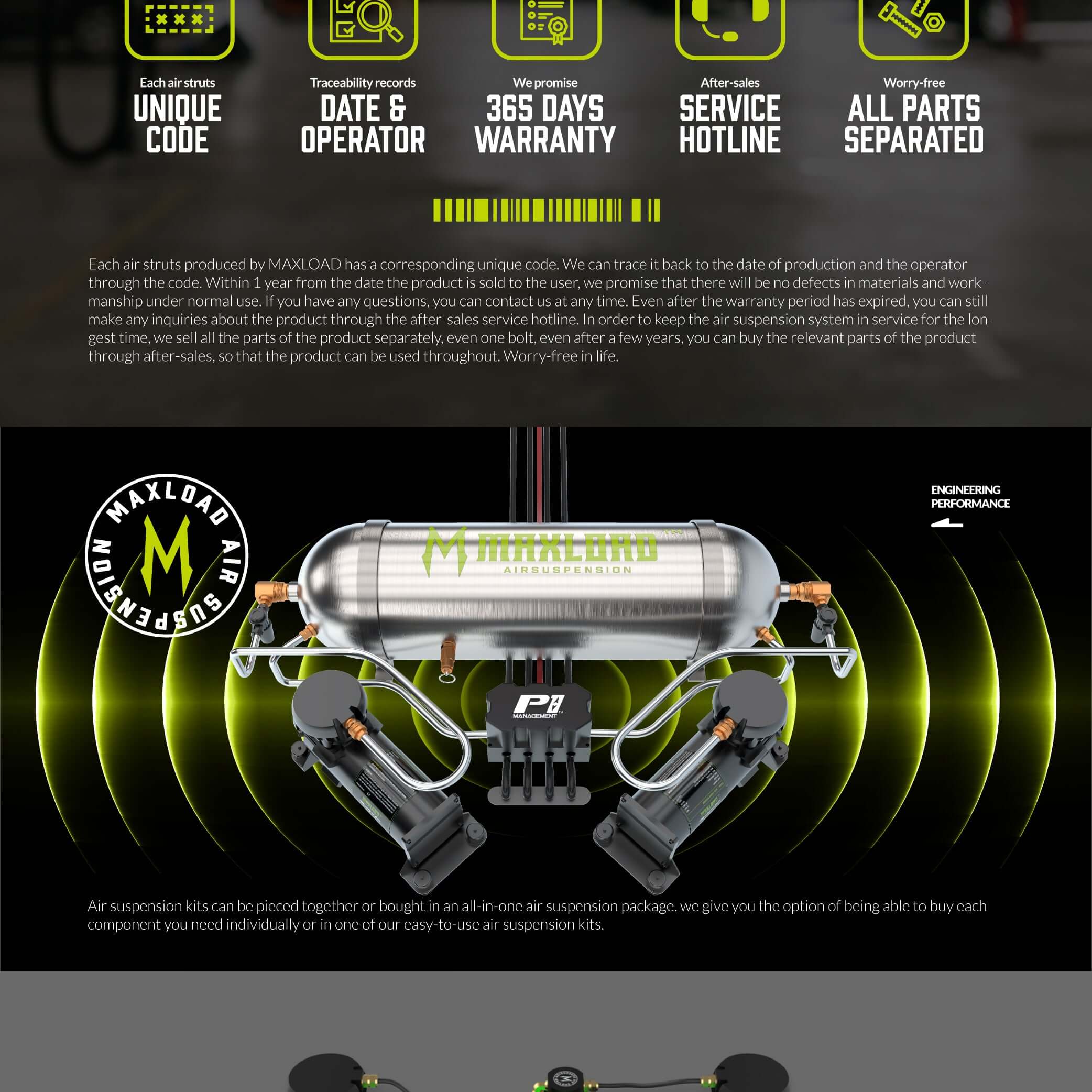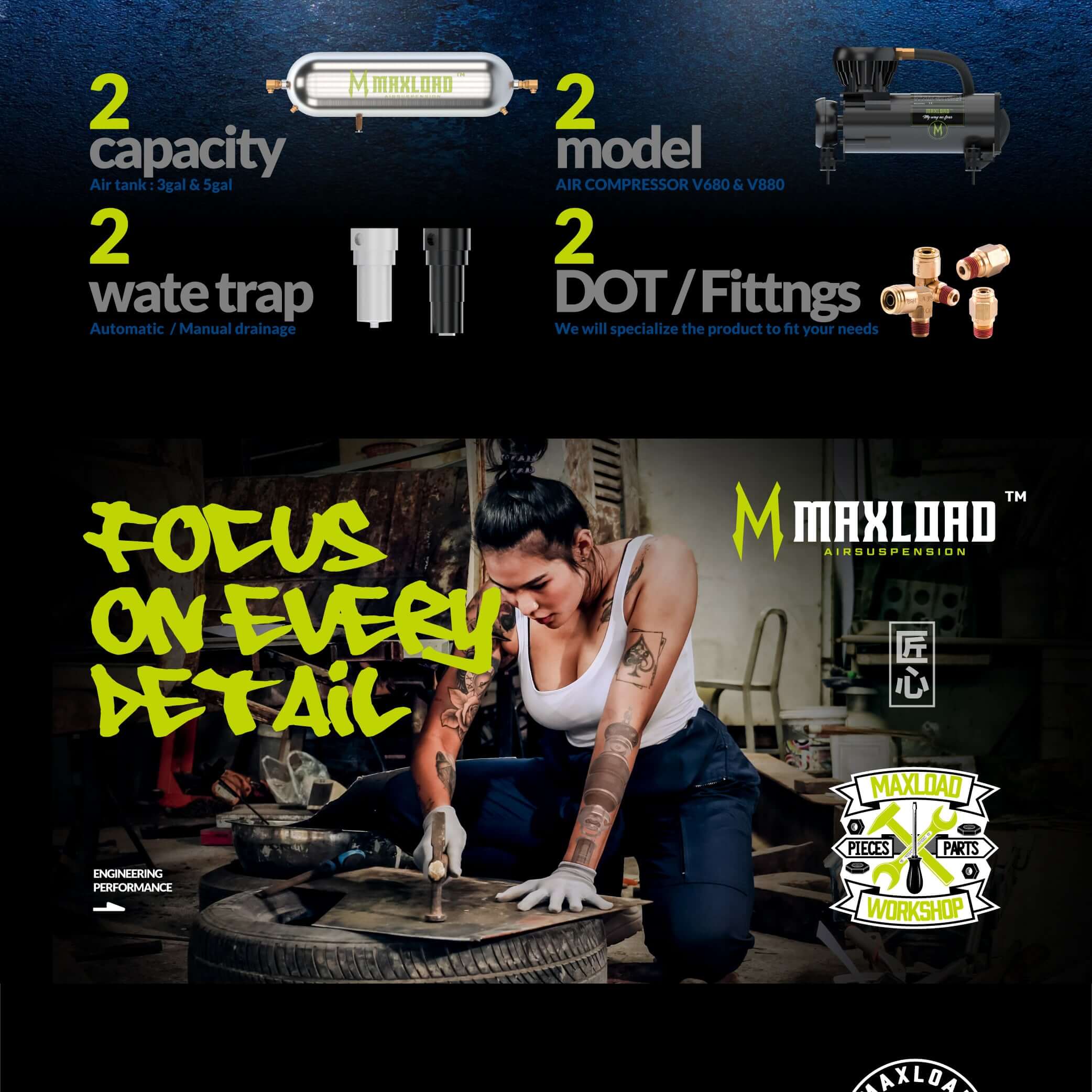 Esta categoría incluye productos relacionados con la suspensión neumática, como tanques, compresores, trampas de agua, accesorios/DOT, placas de inclinación, brazos de control de inclinación, brazos de control de convergencia, eslabones finales de barra estabilizadora, sensores de altura, ruedas y más.