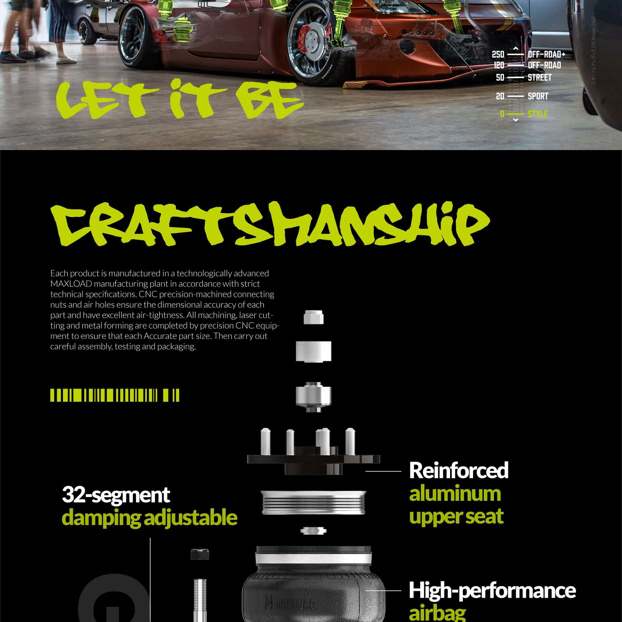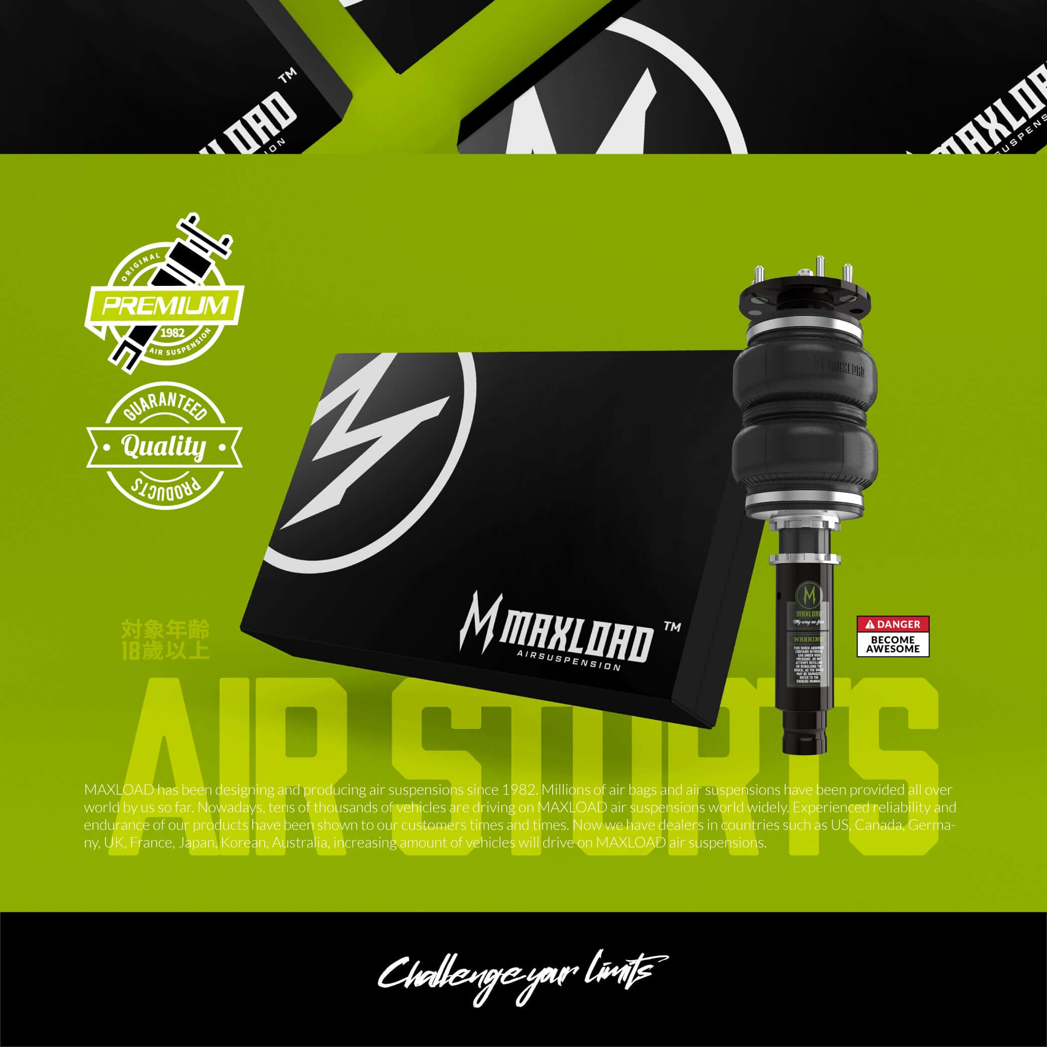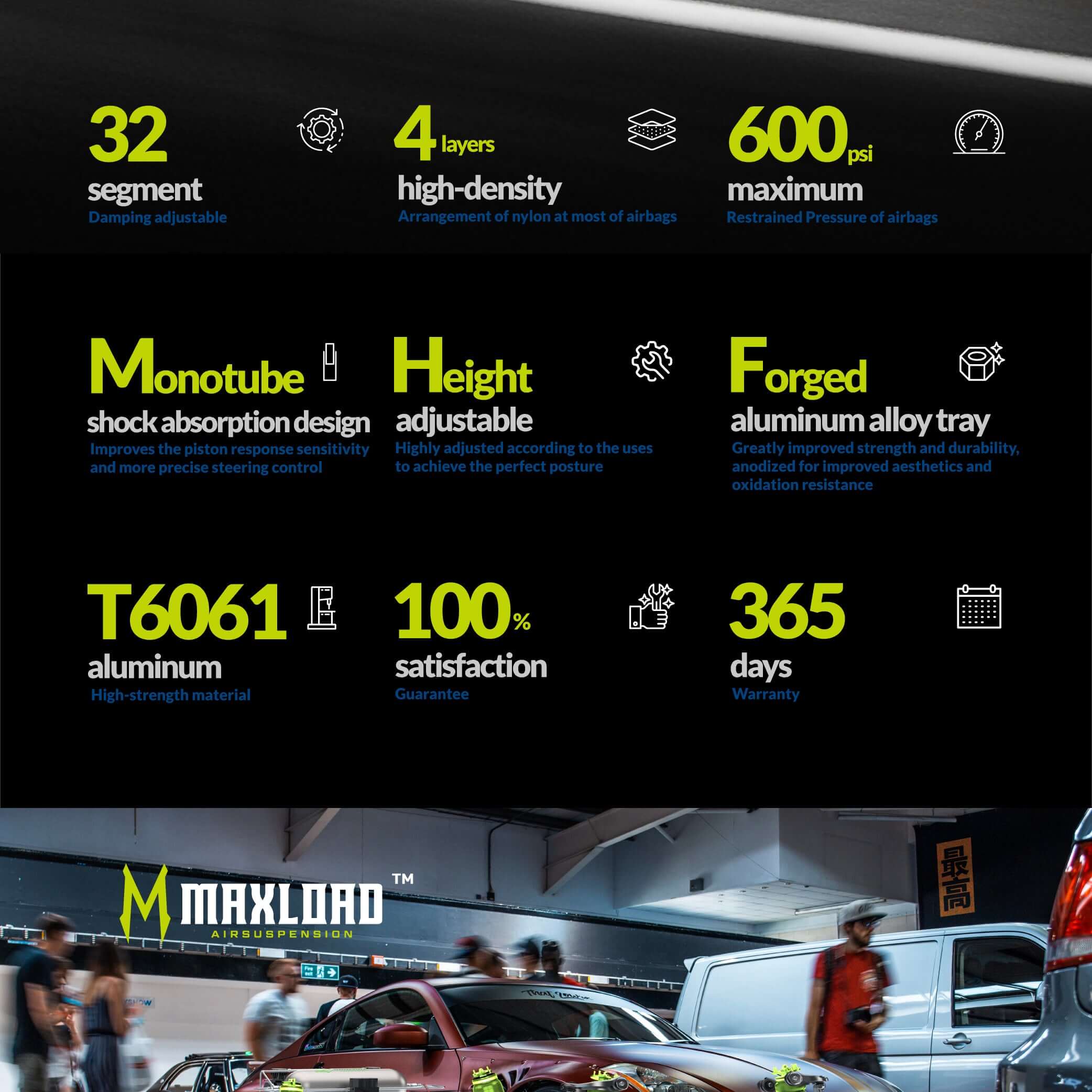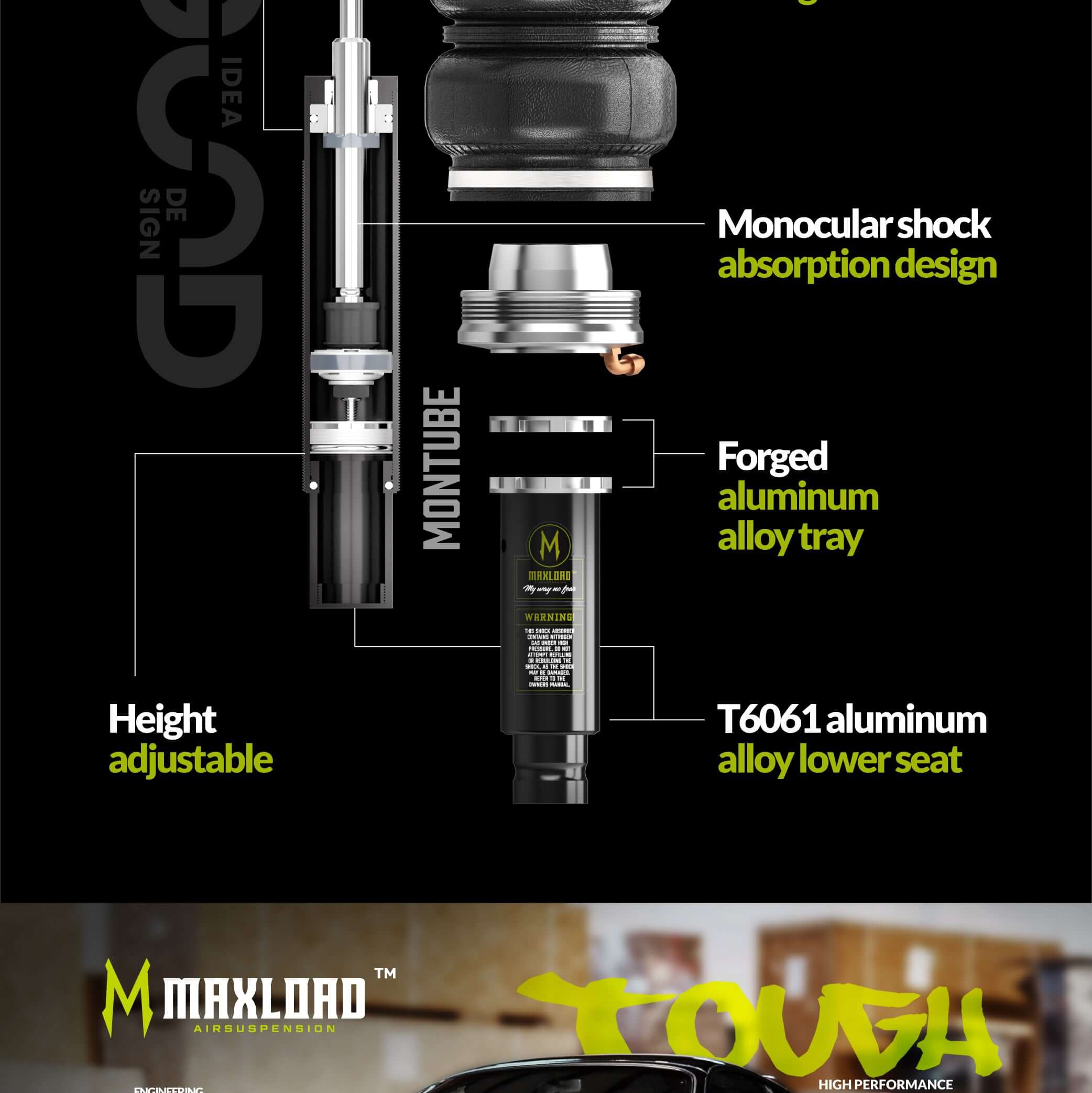 Maxload AirRide has air suspensions of 1000+ vehicle models. Acura, Alfa Romeo, Audi, Bentley, BMW, Buick, BYD, Cadillac, Chevrolet, Chrysler, Citroen, Dodge,Ferrari,Fiat, Ford, Holden,Honda, Hongqi, Hyundai, Infiniti, Jaguar, Jeep, KIA, Land Rover,Lamborghini, Lexus, LYNK & CO, Maserati, Mazda, Mercedes Benz, MG, Mini, Mitsubishi, Nissan, Ora, Peugeot, Porsche, Renault, Saab, Scion, Seat, Skoda, Smart, Subaru, Suzuki, Tesla, Toyota, VW, Volvo and Xpeng. All popular models from 1960 to the latest.